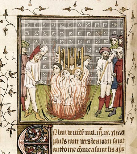 LA CHAINSE OU CHEMISE (Templiers brûlés sur le bûcher, Grandes Chroniques de France, après 1380)