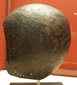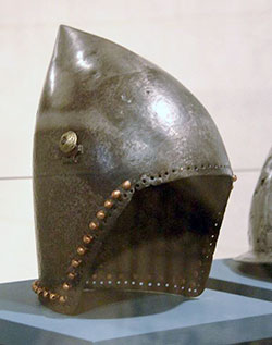 Il y a trois protections de tête principales : la cervelière de fer ou de cuir bouilli, plein ou à écailles. Elle se porte en général sur un chaperon et éventuellement un housson gamboisé garantissant la nuque et le cou en plus. On peut y adjoindre soit un camail de mailles ou un aventail de mailles. Le bacinet est le casque principal de cette période. Il est l’évolution de la cervelière et plus le siècle se déroule plus il descend sur la nuque. Il est porté sans jugulaire sur un housson gamboisé d’une pièce assujettissant le bacinet sur les épaules. On peut y adjoindre un aventail de maille. À noter que ce housson garantira également le menton. On trouve des bacinets simples et d’autres munis de protections faciales comme les bretèches ou les mézails (plat, à bulbe, à klapvisor, à bec de moineau, à museau de chien ou à bec de passereau). Reste le chapel de fer, présent depuis le XIIe siècle, qui est un casque de piéton par excellence, garantissant son porteur des coups descendant des cavaliers. Plusieurs modèles existent. Bien que parfaitement d’époque, le grand heaume porté sur une cervelière ou un bacinet est un casque essentiellement conçu pour le combat à cheval et donc peu à propos pour les piétons. |