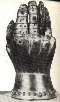 MAINS : Les sources permettent une grande variété de protections ; les moufles gamboisées avec ou sans renfort de mailles, divers gantelets de type hourglass (à clous, à tuiles, à plaques) montés sur un gant de toile forte ou de peau (le gant est cousu au gantelet, il n’y a donc aucun passant ni possibilité d'ôter le gantelet et de conserver le gant). |