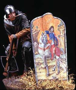 ARMES DE TRAIT : Arc longbow, arc français. Pas de double courbure. Arbalète à arc en bois et étrier uniquement. Les arbalètes à arc métallique apparaissent au XVe siècle. |