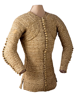 Un vêtement rembourré en laine ou lin ou coton ; en soie pour les plus aisés, composé de plusieurs couches de tissus et/ou de bourre (laine, chanvre, crins). La longueur varie selon l’époque et comme la cotte civile, le jaque, le doublet, le pourpoint se raccourcissent légèrement pendant la seconde moitié du XIVe siècle. Il est possible de superposer un second jaque / doublet / pourpoint au premier. |