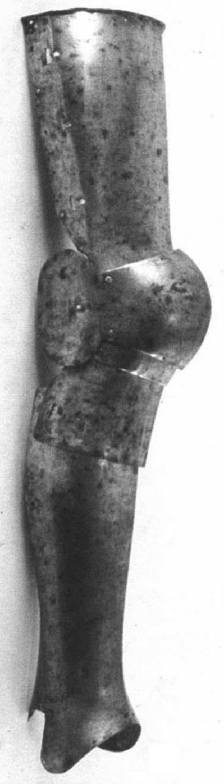 JAMBES : Comme pour les bras, on adopte des éléments d’acier plein solidaires ou flottant dont les éléments sont fixés à des chausses plus ou moins gamboisées (cuissots, genouillères et grèves). Dans ce cas on trouve des éléments de type lamellaire constitués de lames d’acier rivées sur de la toile forte ou du cuir. En dernier point on trouve de simples protections de cuir durci, peu fréquents hormis pour les tournois.