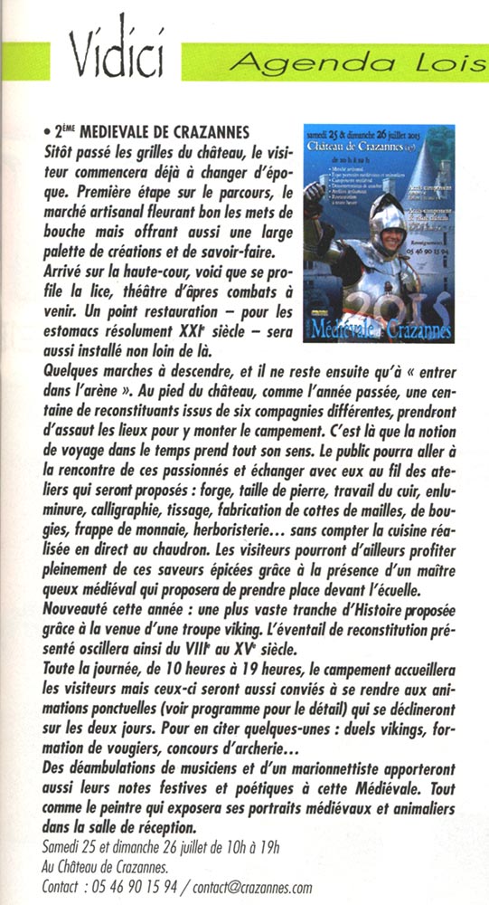 Article paru dans Vidici n°59, mensuel gratuit, édition Pays Saintais - juillet/août 2015 |